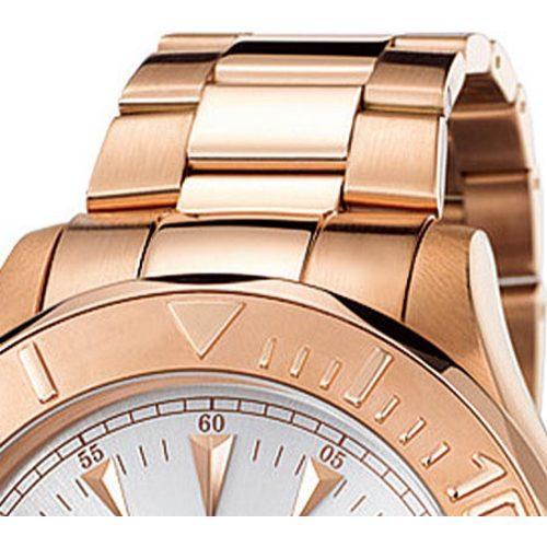 This sophisticated watch features automatic twenty one jewel movement, 18kt rose gold plating, a surgical stainless steel case with exhibition case back, unidirectional turning bezel, screw down enamel crown with inset logo, anti-reflective mineral crystal, Tritnite® hands, date display, is shock resistant, and has a surgical grade solid stainless steel band with diver buckle and safety clasp. This watch is water resistant to two hundred meters.
