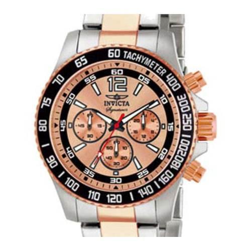 The Invicta Signature features a Japanese movement (VD54), push crown, mineral crystal, and diver safety clasp. Water resistant to 50 meters.